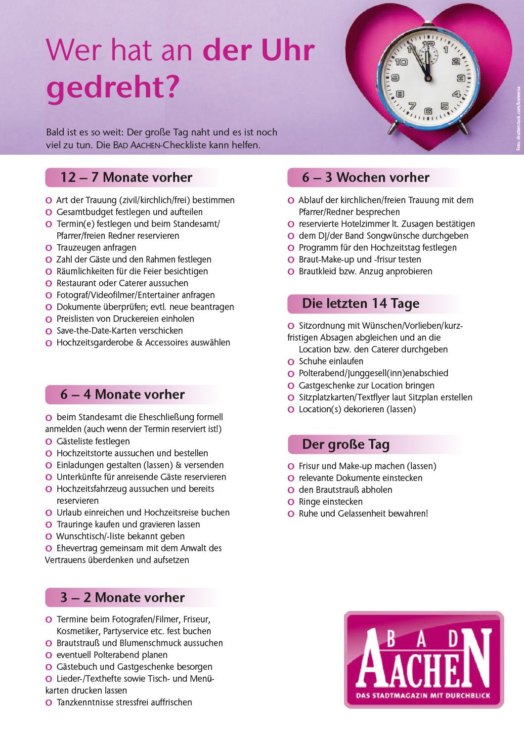 Wie ist es möglich, bei einer langen Gästeliste den Überblick zu behalten? Ist es sinnvoll, erst die Feierstätte zu buchen oder erst die Menüfolge festzulegen? Woran müssen Brautleute in den letzten Tagen vor dem "Ja" noch dringend denken? Solche und unzählige weitere Fragen stellen sich Paaren, wenn sie heiraten wollen. Aber nicht verzagen: Mit den exklusiven Planungshilfen von BAD AACHEN vermeiden die Verliebten Chaos bis zuletzt und treten völlig entspannt vor den Standesbeamten. Wer den Durchblick hat, ist eben klar im Vorteil - mit BAD AACHEN-Listen zum Runterladen!